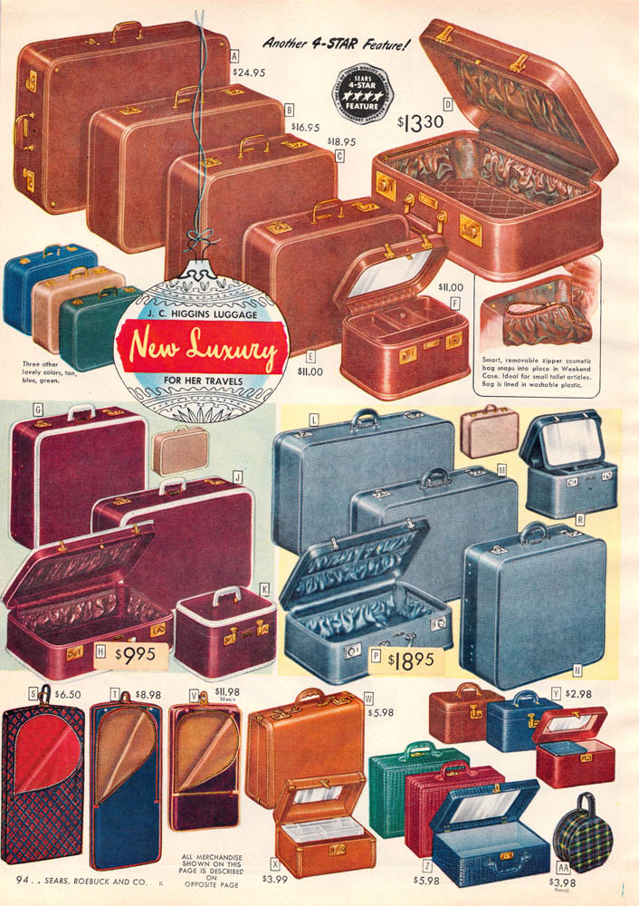 I adore vintage luggage. To me it always looks so much classier than new luggage. I posted some pictures of 1950's luggage from vintage catalogs. I find the quality of old travel cases so much better too, which would make sense considering so many have lasted over the years. The only downside I find is that they're a bit heavier than modern luggage. But that doesn't stop me. I just bought a cute little blue travel case this past weekend. It's one of those round cases thats lined inside, and it comes with a cute little mirror. I can't wait to use it!